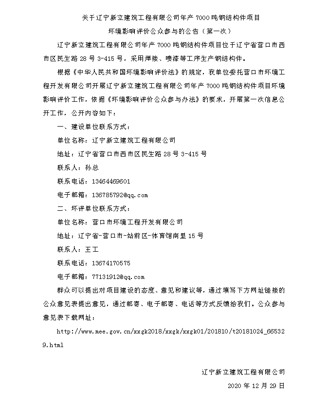 關(guān)于遼寧新立建筑工程有限公司年產(chǎn)7000噸鋼結(jié)構(gòu)件項目環(huán)境影響評價公眾參與的公告(第一次)