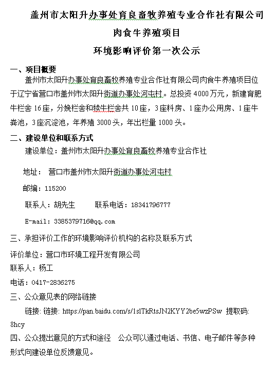 蓋州市太陽(yáng)升辦事處育良畜牧養(yǎng)殖專業(yè)合作社有限公司 肉食牛養(yǎng)殖項(xiàng)目 環(huán)境影響評(píng)價(jià)第一次公示